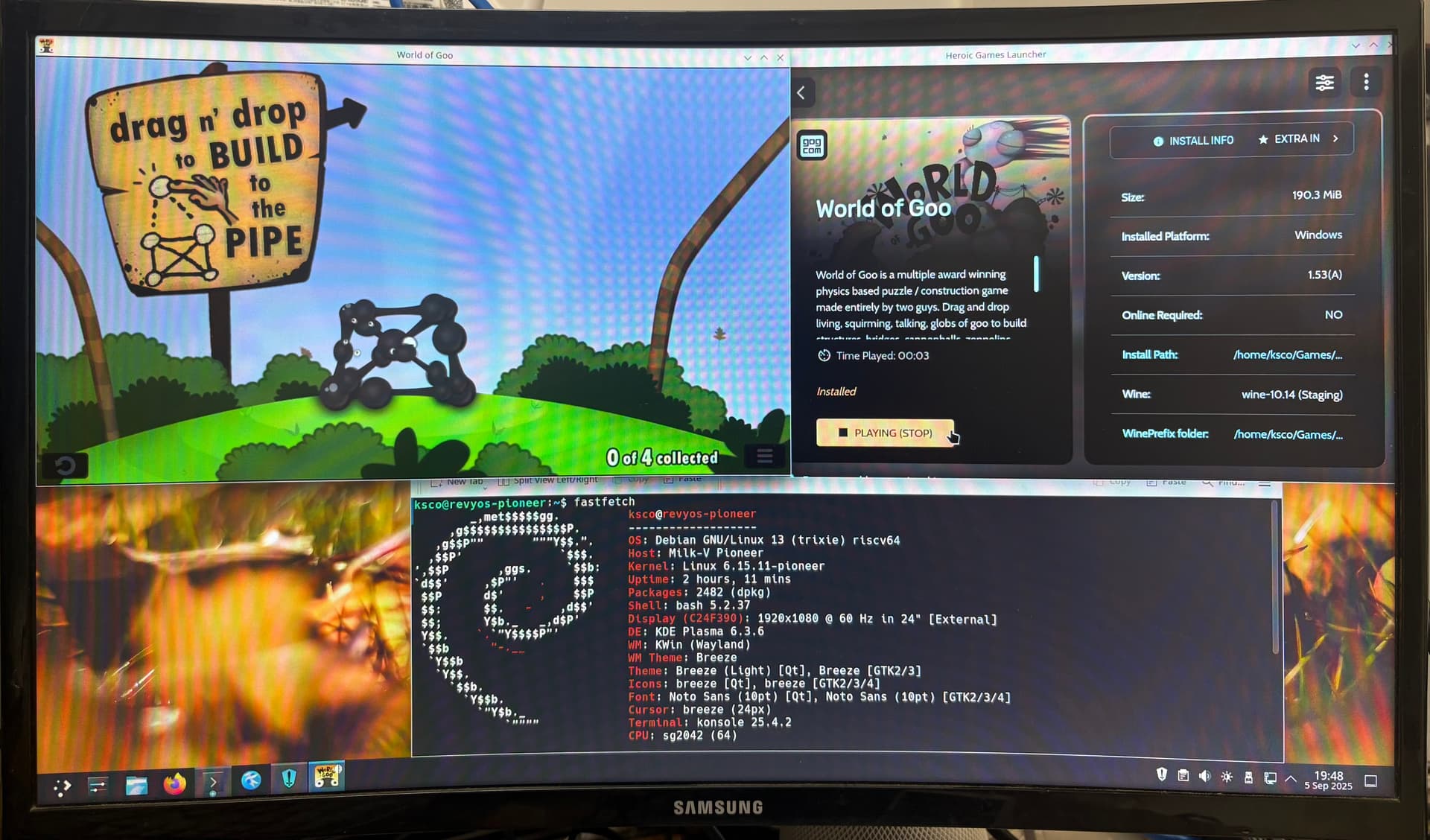 图片中演示的是 GOG 粘粘世界的 Windows 版本,使用了 Wine 10.14 staging 运行,个人觉得体验不错,因为节省了很多环境搭建的时间。