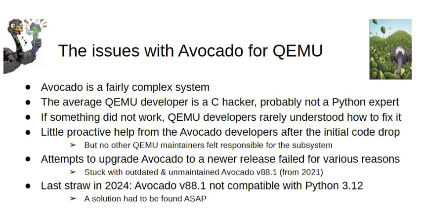 而 QEMU 团队内部也没有明确的负责人接管 Avocado 子系统,导致测试套件长期处于 “放养” 状态。