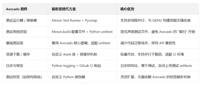 核心思路是:放弃对 Avocado 的强依赖,基于 QEMU 现有技术栈(Meson+Python)打造轻量、可控的原生测试框架 。