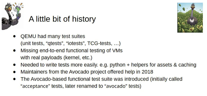 2018 年,QEMU 团队引入 Avocado 框架(初期名为 “验收测试”,后更名 “avocado 测试”),并得到了 Avocado 项目维护者的支持。