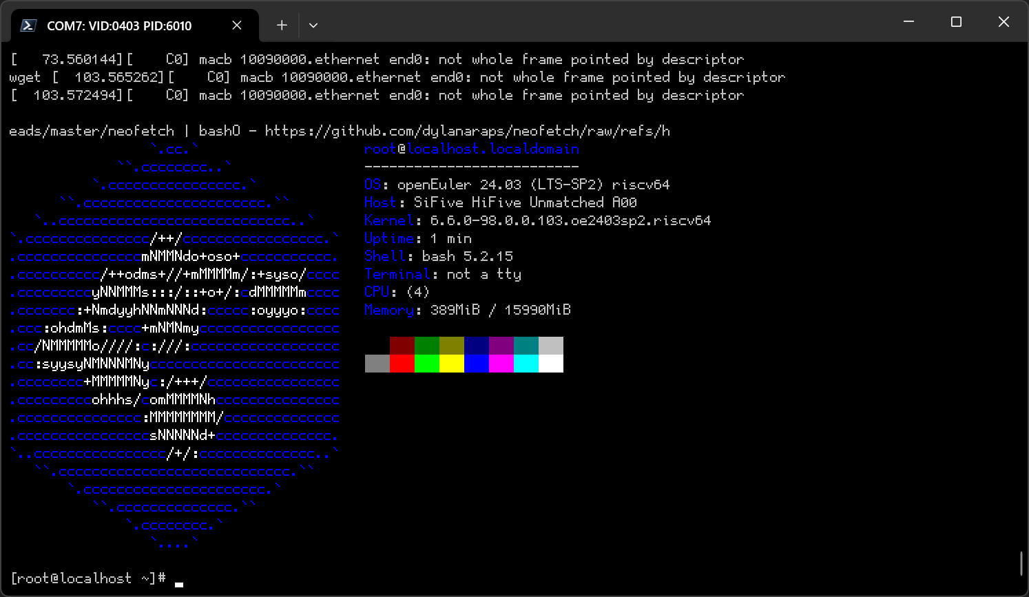 注意:Unmatched 不是目前 openEuler 主线支持设备,不能保证所有硬件功能完全可用。比如目前内核可能刷网卡相关的 log(但似乎不影响使用)。