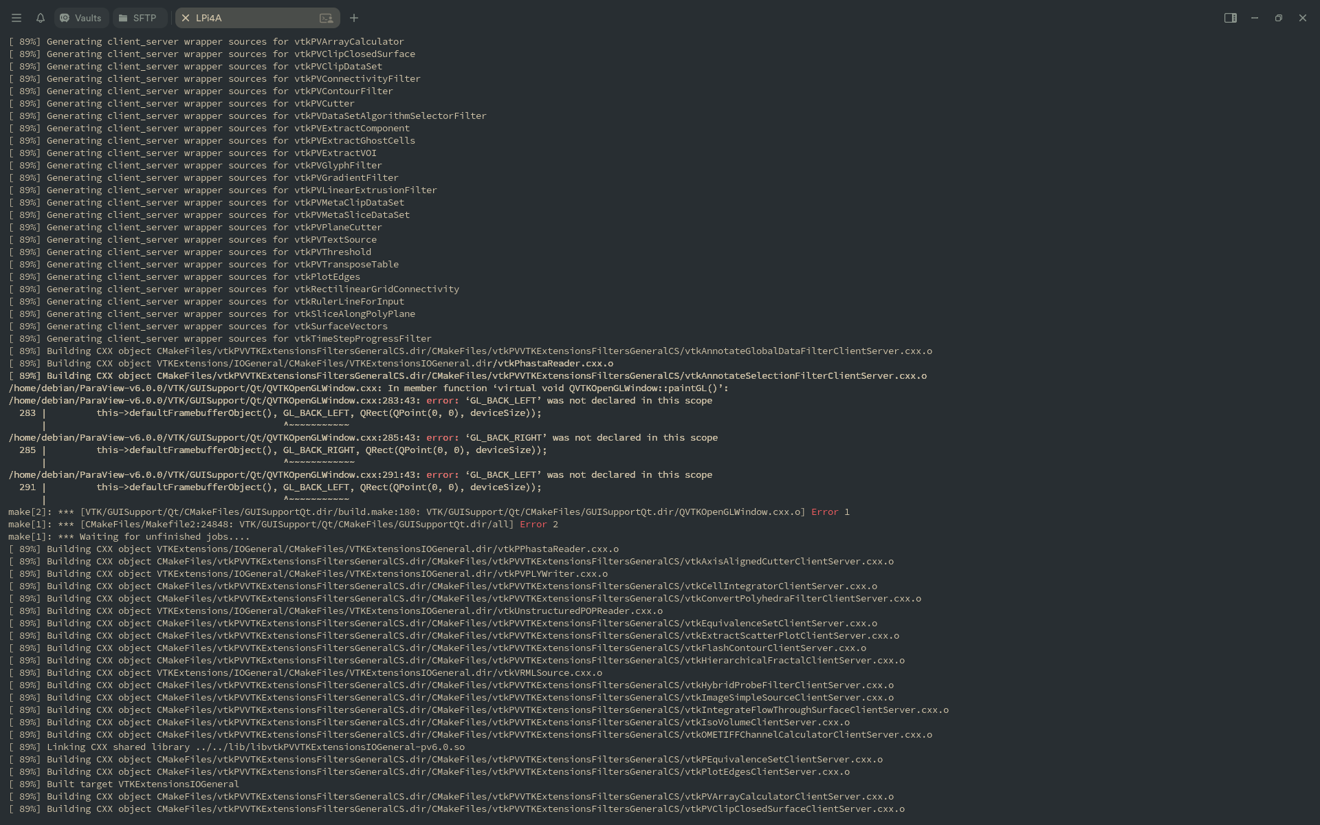 Paraview,VisIt - 失败原因: 遗留 OpenGL API 依赖。这两款强大的可视化软件都依赖于 VTK。在编译 VTK 相关模块时,我们遇到了相同的致命错误: