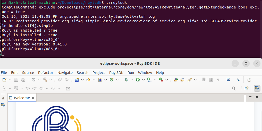 ./ruyisdk启动 IDE。 - 首次启动时,IDE 会提示选择工作空间 (WorkSpace)。您可以选择一个已有目录或创建新目录。