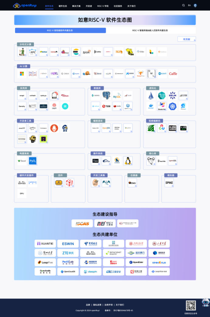 这份生态图基于RVI国际协会的软件生态发展态势,全面汇集了各家共建单位的上游贡献,凝聚了国内产业伙伴在RISC-V软件领域取得的适配和优化成果,已在“如意 RISC-V 社区”上线(https://openruyi.cn/software/ecosystem ),成为国内首个RISC-V的生态软件全景图与共建平台,具有重要示范和里程碑意义。