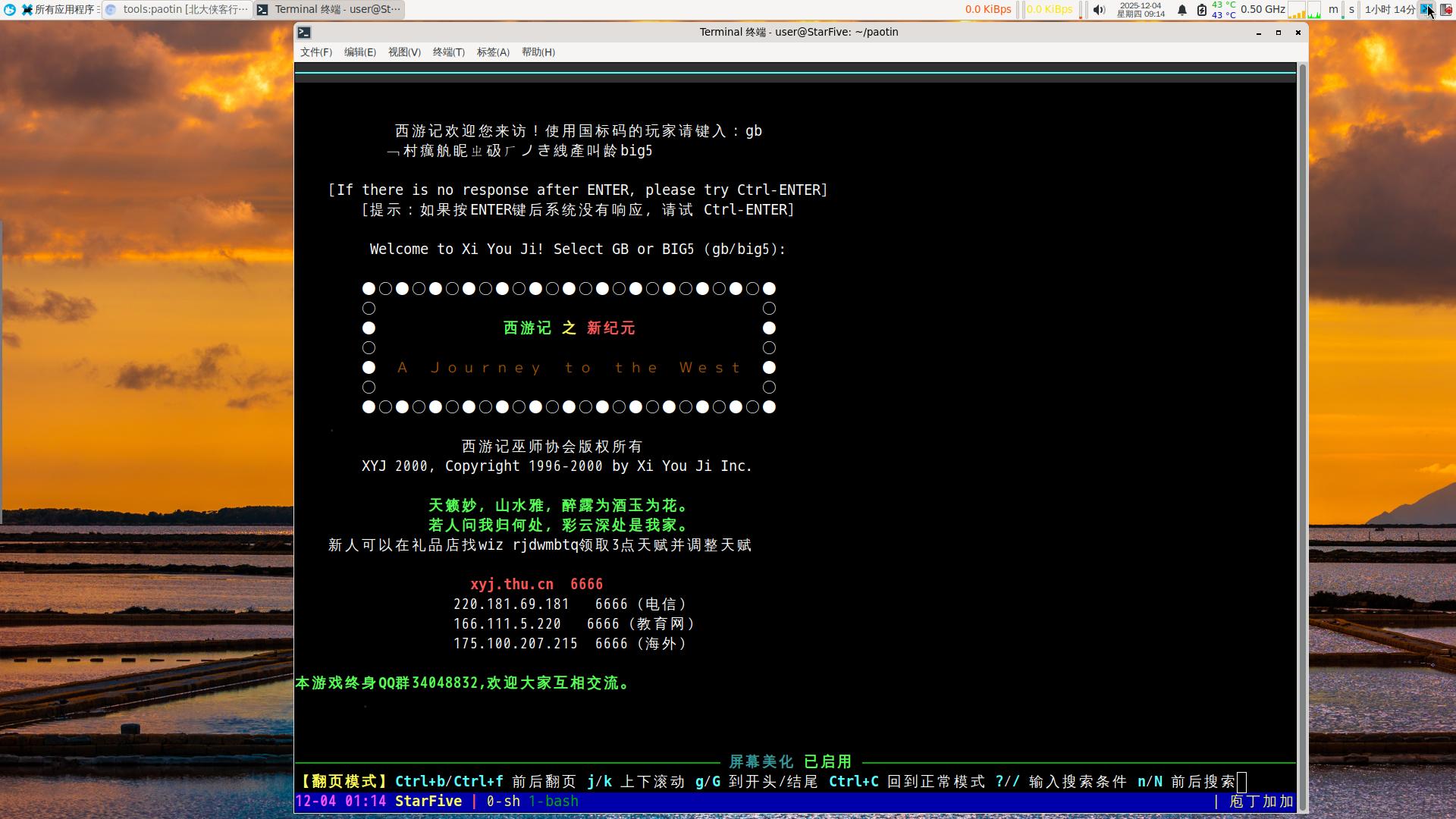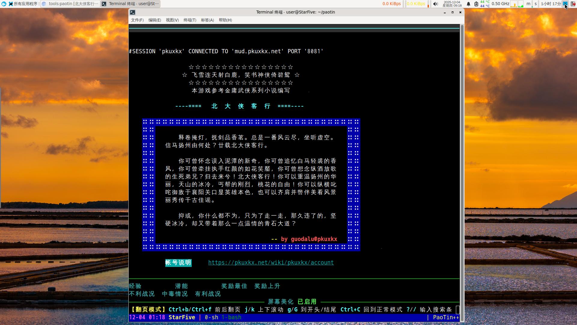 MUD流行的专用客户端里,有个全平台全操作系统都能用的PaoTin++(炮艇),我曾经在X64和树莓派4b使用过;PaoTin++开发时,应该市面上还没流行riscv架构,所以我尝试在riscv上运行并成功,最初是在revyos-lpi4a上测试成功,然后在VF2上完成文章。