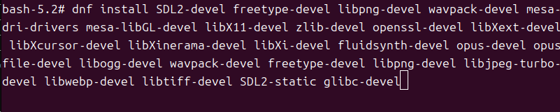 dnf install SDL2-devel freetype-devel libpng-devel wavpack-devel mesa-dri-drivers mesa-libGL-devel libX11-devel zlib-devel openssl-devel libXext-devel libXcursor-devel libXinerama-devel libXi-devel fluidsynth-devel opus-devel opusfile-devel libogg-devel wavpack-devel freetype-devel libpng-devel libjpeg-turbo-devel libwebp-devel libtiff-devel SDL2-static glibc-devel