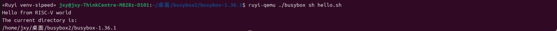 编写简易 Shell 脚本,通过 Busybox 内置的 Shell 解释器,在ruyi-qemu模拟器中执行脚本,验证 Busybox 命令执行能力。