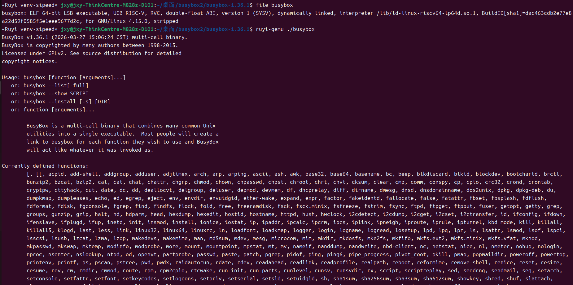 编译完成后生成 RISC-V 架构的 busybox 二进制文件,通过file命令验证文件架构格式,使用 RuyiSDK 内置的ruyi-qemu模拟器直接运行程序,查看 Busybox 支持的命令集。