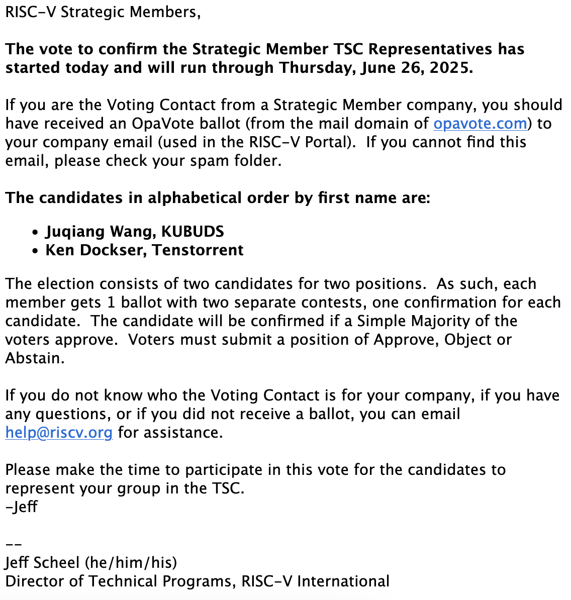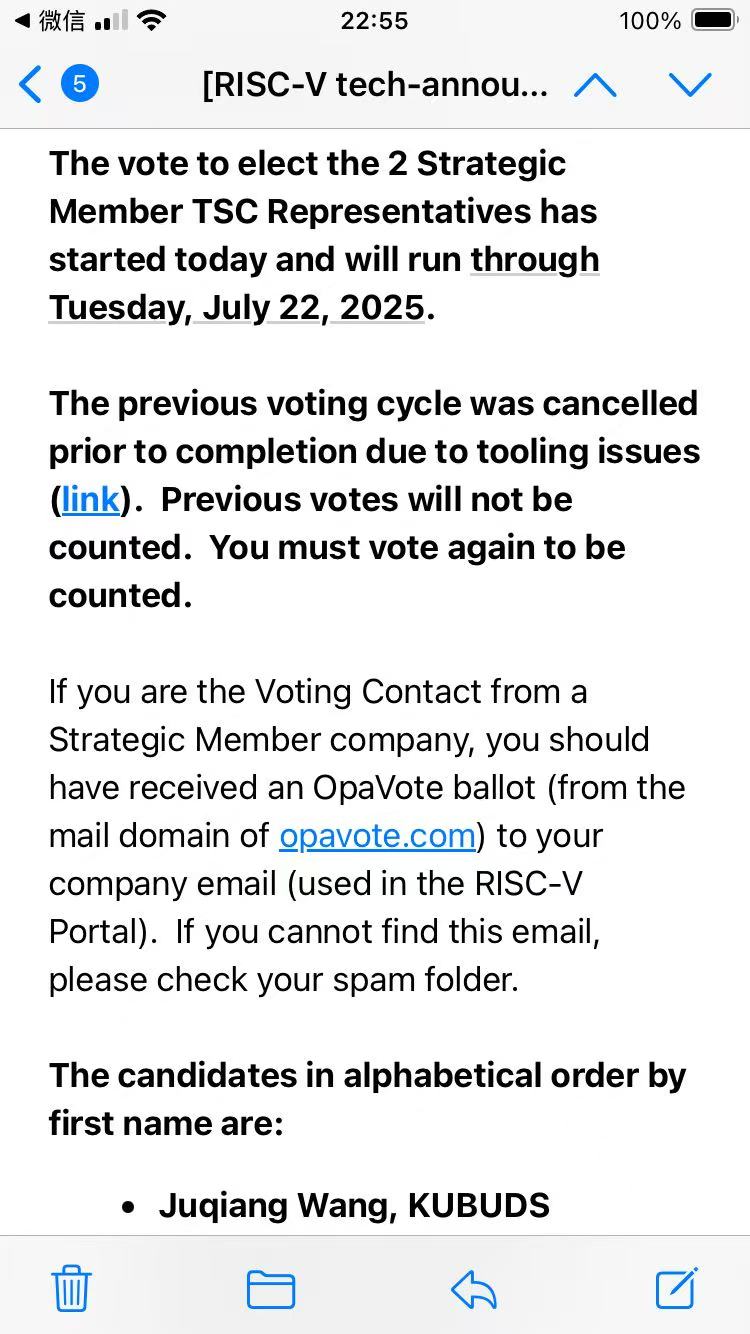 (之所以是第二次,是因为RISC-V国际基金会开始竞选之后发现漏掉了一个候选人,于是叫停了选举,重新开始——但是王俊强名字还是又一次弄错了)