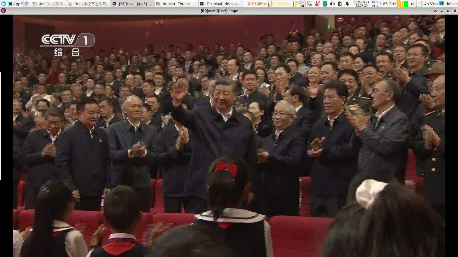 结果: apt-get dist-upgrade,更新了近千个包后,系统没崩溃,所有的程序好像都能正常运行,包括不能运行的chromium109。这不是最让我惊叹的,我发现硬件解码都还能运行,本地媒体文件播放和网页流媒体都可以很流畅,屏幕分辨率为1920X1080。所以,升级到debian13,似乎并没能影响所有的驱动。附图: