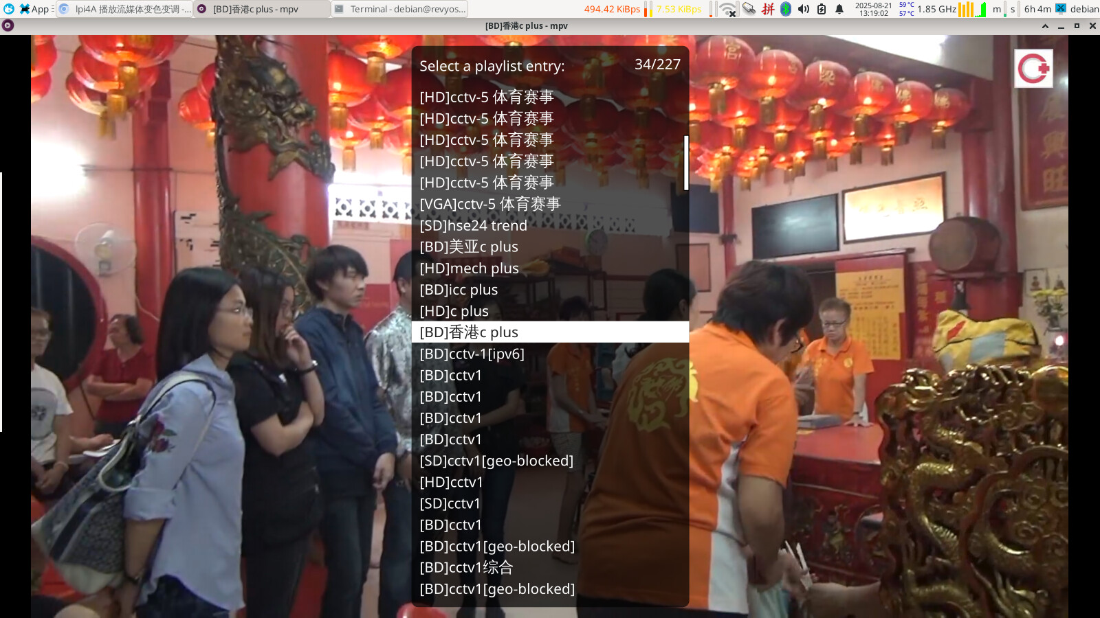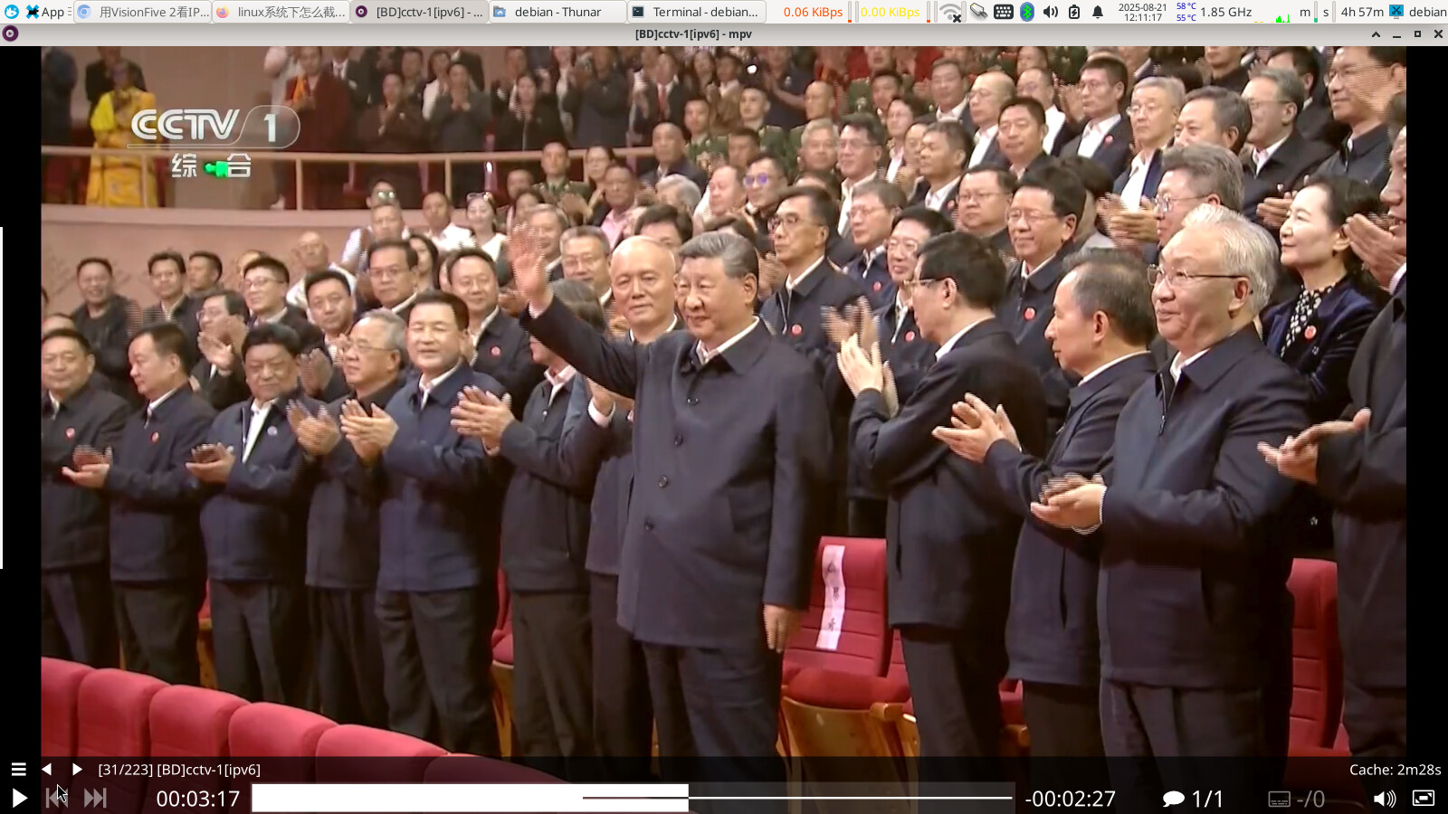 上图是本地媒体播放,图上有debian13版本、内核版本、设备型号、CPU GPU占用率、mpv版本,媒体播放时,cpu占用50%左右、gpu占用35-40%(图上显示80% ,可能是因为截图飙升的),可以确认是使用硬件解码,才能流畅播放的。