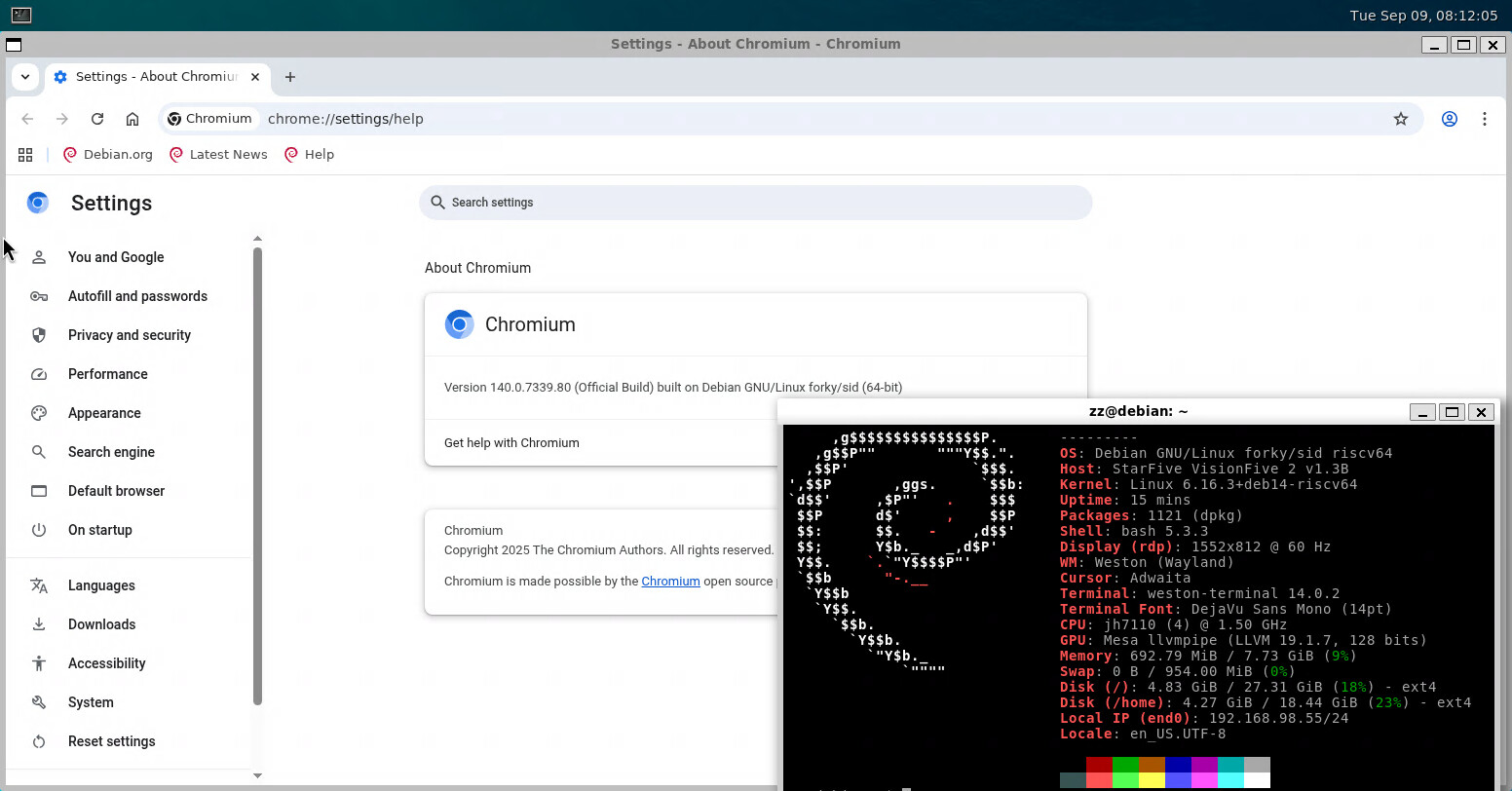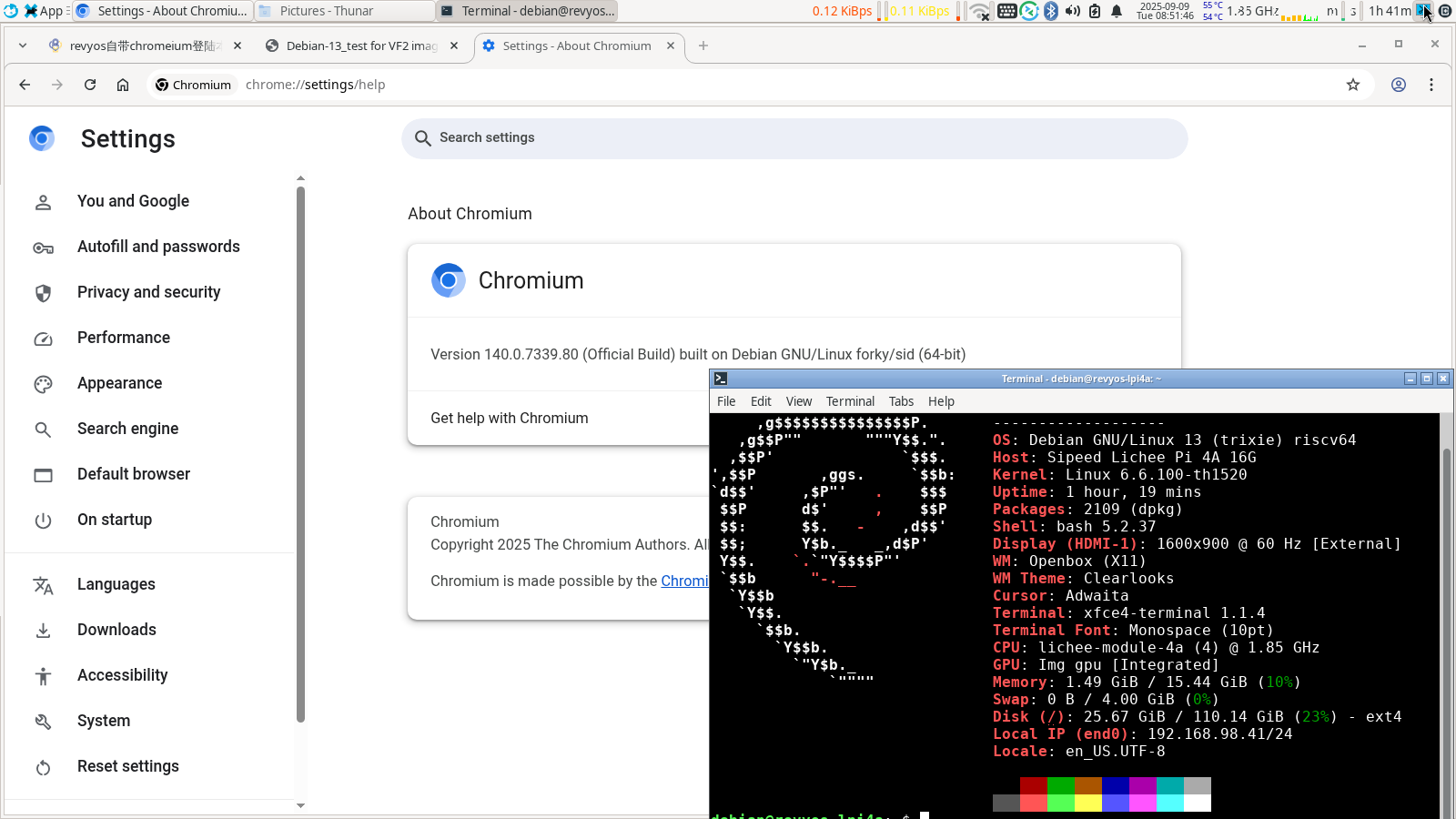 另,debian14 for VF2上我也测试过安装运行chromium140,运行正常,所以可能安装包可以在其他riscv开发板上也能运行。