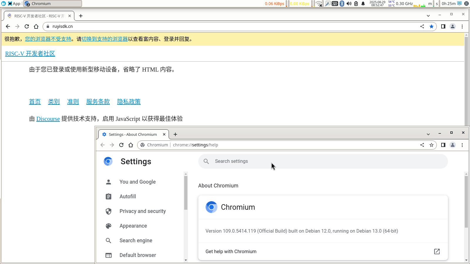 今天8月29日,用revyos自带的chromium109,已经不能登陆本论坛了,登陆其它网站都正常。登陆本论坛时,页面提示:你的浏览器不受支持,附图。反正chromium109的硬解码不正常,干脆就卸载,安装为香山riscv适配的chromium129来使用,chromium129登陆本论坛正常(现在就是用它在编辑本文),继续可以上传4k图片,播放流媒体不变色,应该是cpu软解码,480p都跳帧严重。
