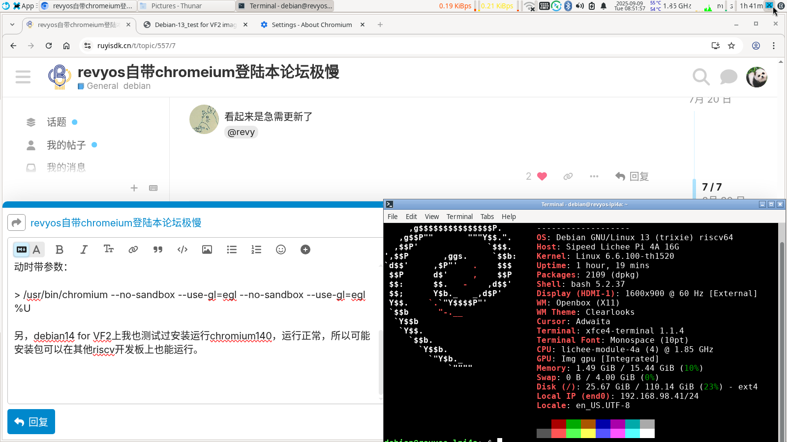 之前帖子说的revyos_lpi4A自带chromium109, 因版本太低,打开本论坛不能登陆账户、页面只能部分浏览,所以从网上找到最新 chromium140 for riscv安装使用,chromium140运行正常,登录本论坛如之前一样,登录时很慢,登陆完后浏览流畅;播放流媒体不变色(使用软解码的,GPU占用0)。附截图,附chromium140 deb安装包下载,