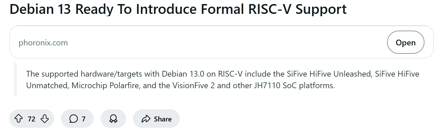新版本计划于 8 月 9 日发布,届时,Debian 13.0 将在 RISC-V 架构上支持多款硬件和平台,包括:SiFive HiFive Unleashed、SiFive HiFive Unmatched、Microchip Polarfire,以及 VisionFive 2 和其他基于 JH7110 SoC 的平台。