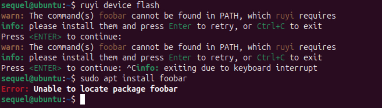ruyi需要调用某些外部命令但无法找到时,如果当前终端可以交互,会等待您安装以便重试了。您可以在另一个终端下安装所需命令,再回到ruyi所在终端按回车键继续。您也可以按 Ctrl+C 退出。感谢 RuyiSDK 社区论坛的 @Sequel 同学反馈!